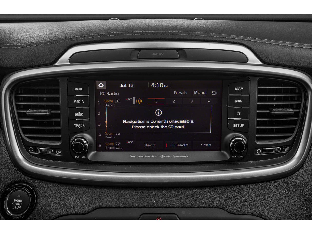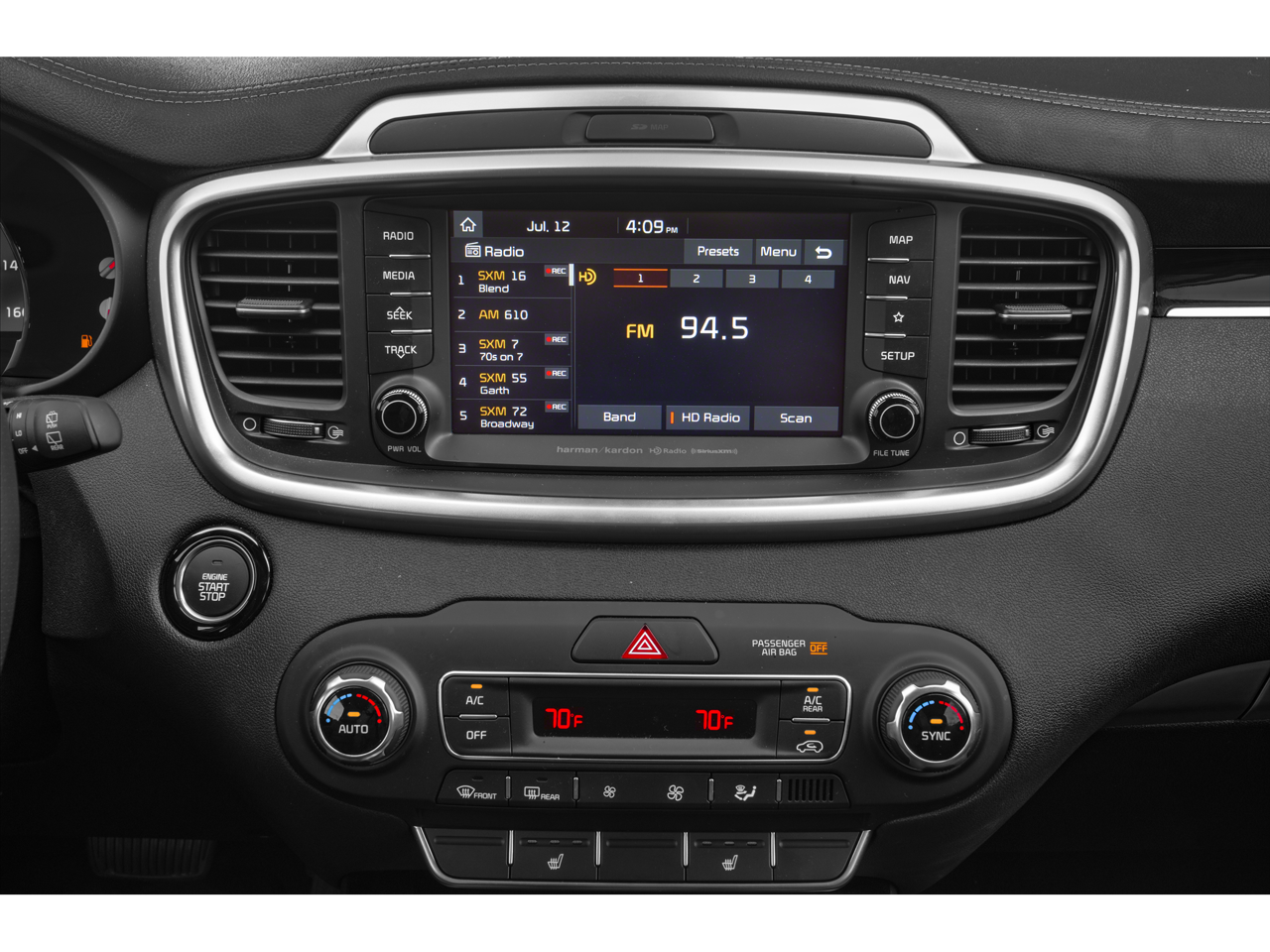 - Radio: UVO eServices w/Premium Navigation -inc: 8" touch-screen color display, harman/kardon audio, 10 speakers, AM/FM/HD radio, MP3, support for Android Auto and Apple CarPlay, SiriusXM, 2 USB charging jacks, USB/auxiliary input jacks and Bluetooth® connectivity